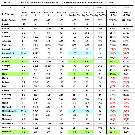 A table such as the attached is a mental feast for those interested in understanding Covid-19. Not only does it show deaths in total and per week, but period improvements and regressions are also easy to see. Further, a balanced perspective is gained by having the associated death rate included. The ability to quickly compare key death data of all states is also invaluable.
