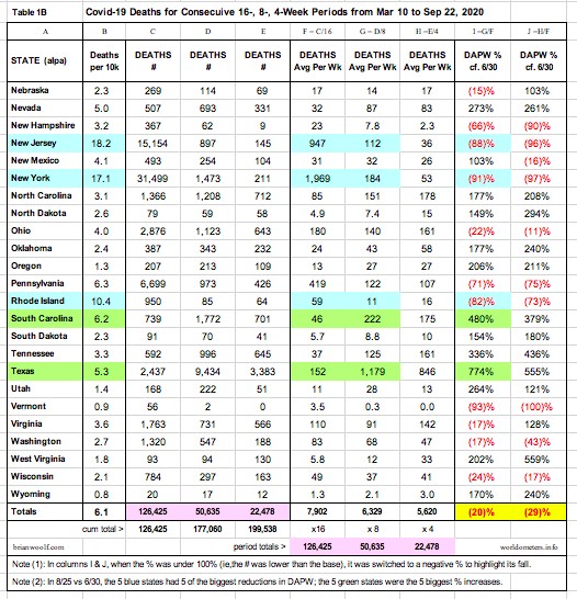 During the 16 weeks ending Jun 30, the 50 US states suffered weekly an average 7,902 Covid-19 (CV)-related deaths. The next 8 weeks (to Aug 25), saw average weekly deaths drop 20% to 6,329. Then in the following 4 weeks (to Sep 22), average weekly deaths averaged 5,620, an 11% decline from the 8-week Aug 25 period. This meant a decline of 29% from the 16-week period (to June 30.). Those two consecutive drops are dramatic-and a surprise, given the fear flowing from news headlines.