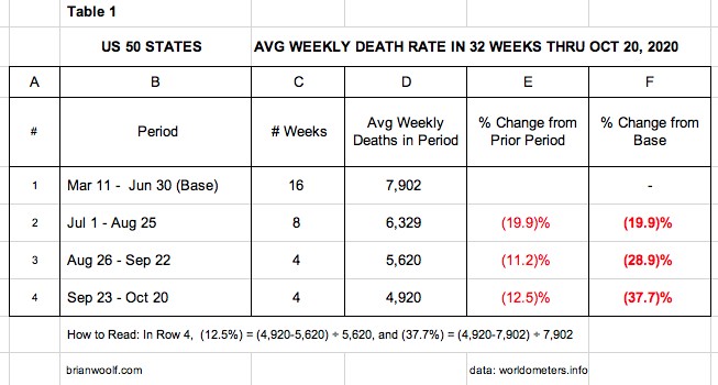 In the US, average weekly Covid-19 deaths have quietly, but steadily, been dropping. The most recent 4-week period (ended Oct 20) shows weekly deaths dramatically down 37.7% from the first 16 weeks of reporting (ended June 30). Great news!