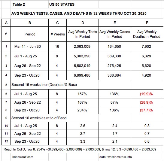 To illustrate the interrelationship of tests, cases, and deaths, Table 2 shows their weekly averages in the initial ("Base") 16-week period to June 30 and the three following shorter periods (also totaling 16 weeks) from July 1 to October 20.