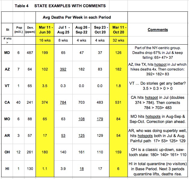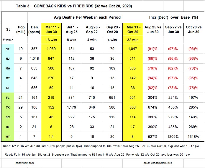 In an earlier article, The Comeback Kids and Firebirds, I discussed the two competing forces involved in the big changes between the Base and following period: the NY-centric states were recovering from weeks of high CV deaths, while some other states were hit with outbreaks of Covid hotspots. Result? The five Comeback Kids' average weekly deaths dropped 82-94%, while the five Firebirds' average weekly deaths increased 300-700%. (See Table 3.)