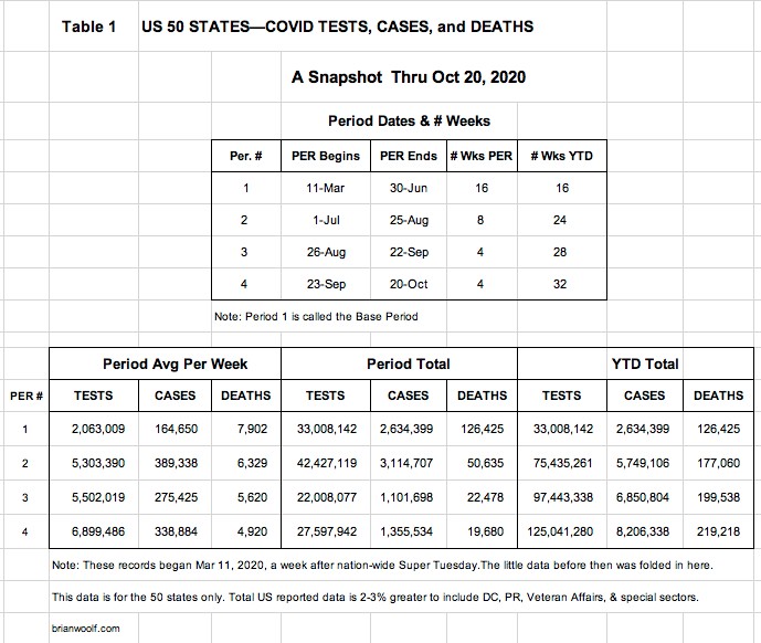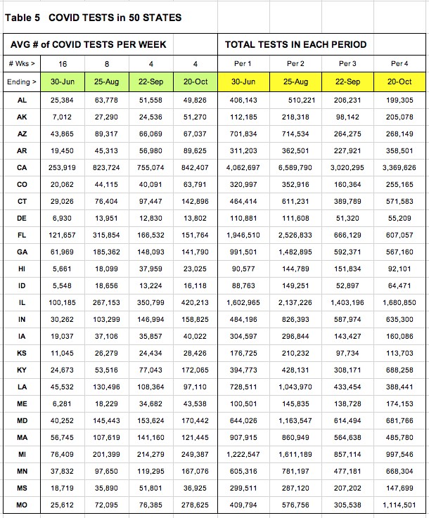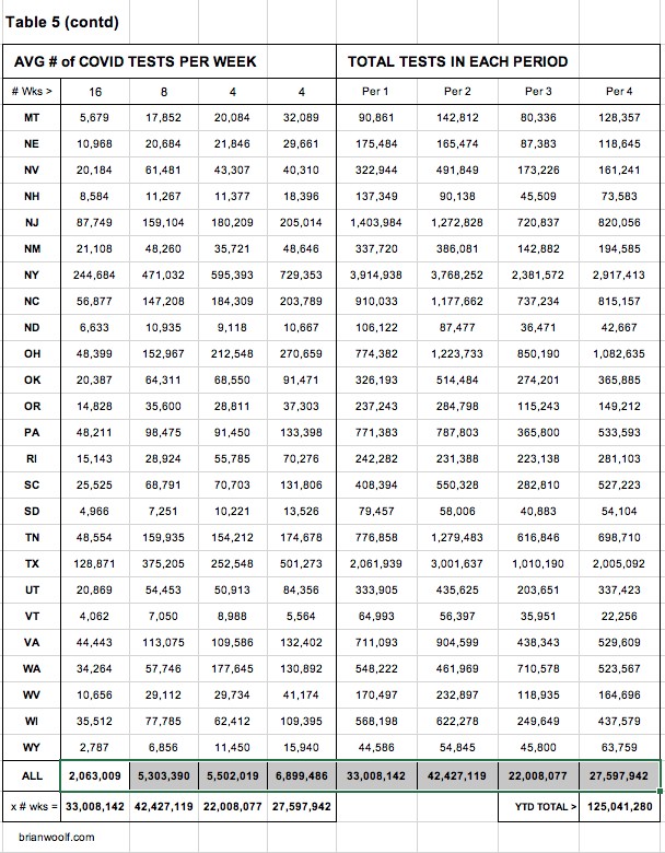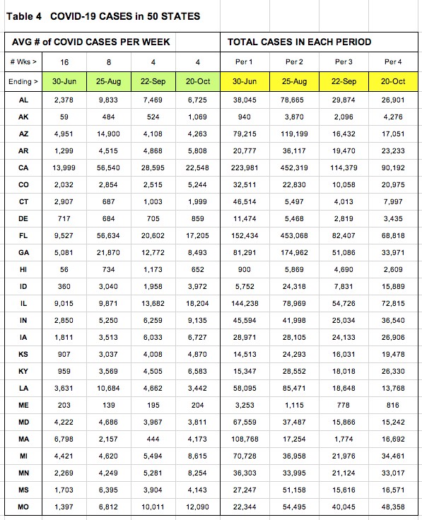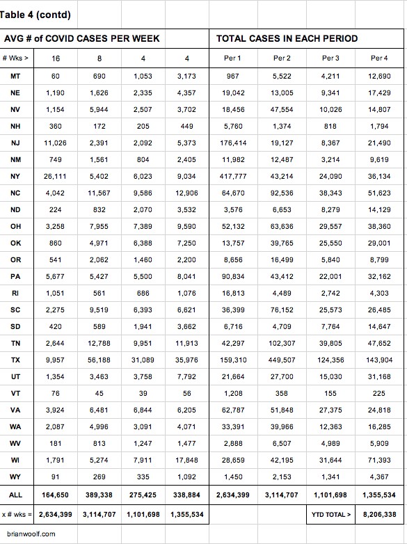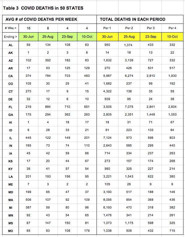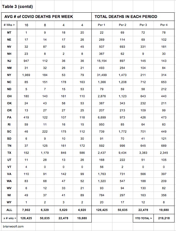 Table 3: You'll see numbers showing that our weekly deaths have dropped almost 40% in the past 16 weeks. And you can see which states are helping (and hurting) the most.