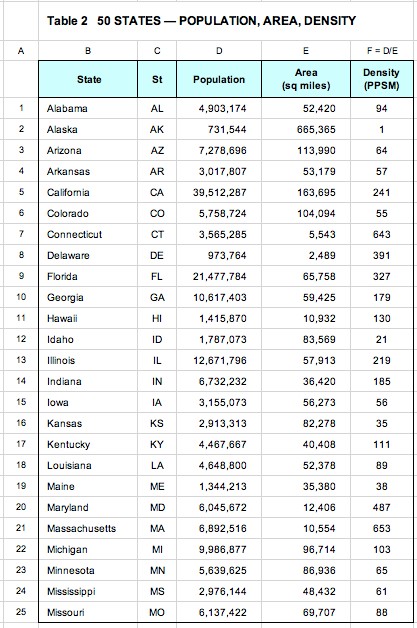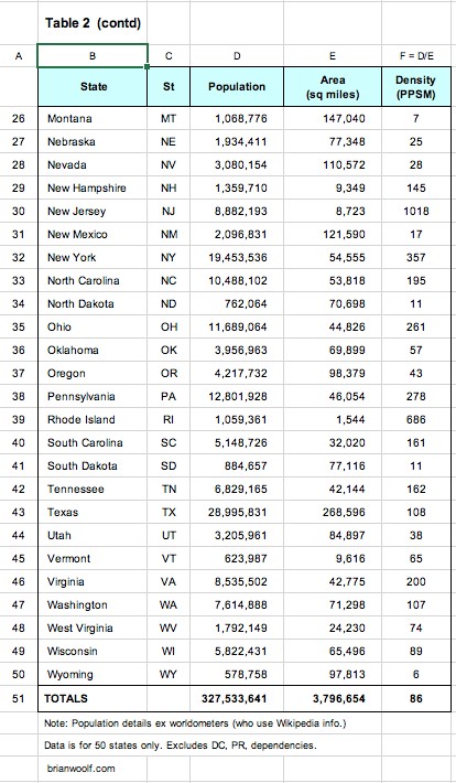 Table 2: The population, area, and density of each state. You'll see how different each is. And you'll understand why states with lower densities typically have lower CV death rates.