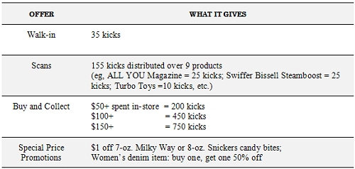 - Rewards for visiting stores and interacting with products. A member can earn kicks just by doing, eg, entering a store or scanning item barcodes. Rewarding such simple acts may seem wasteful but, in reality, are ways that, when repeated over time, increase knowledge of, familiarity with, and favorability towards, the store or product.
