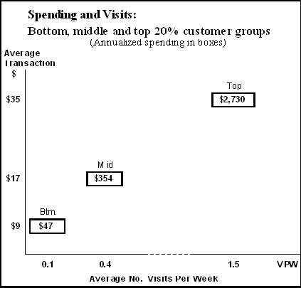 As seen in the following chart, the top 20% of a store's customers spend, on average, about $52 a week (1.5 visits per week times $35 per visit) over the course of a year. The middle 20% of the customers spend about $7.00 a week and the bottom 20% spend just under $1 a week! In other words, over any 12 month period, the top 20% of the customers spend 50 times the amount of the bottom 20%!