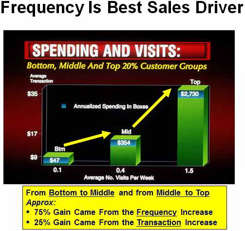 Frequency programs are easy to design and administer, especially if you have a customer-identification system. And successful programs do convert customers into higher-spending customers. By giving more of your promotional programs a Frequency bias you increase the reasons why your customers should return ... and return and return. If you wish to build sales, remember: Focus on Frequency!