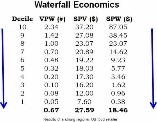 Incidentally, in case you are wondering about the data in Decile 10, those customers shopped an average of only 1.30 times during the whole 6-month period (ie, 0.05 Visits Per Week), spending an average of $7.60 per visit, which calculates to an average spend per week of $0.38 (0.05 x $7.60 = $0.38). They obviously comprised a lot of new customers who didn't stay long!