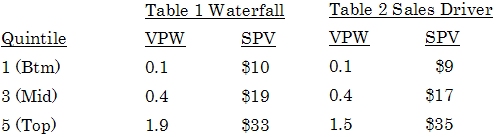 From this Frequency table, one can calculate that as customers move from Quintile 1 to Quintile 3 and from Quintile 3 to Quintile 5, approx 75% of the sales gain of customers' weekly spending is correlates to an increase in Frequency and 25% correlates to the increase in the average basket size (SPV). In other words, Frequency has triple the direct relationship impact on sales gains than Spending Per Visit, numerically reinforcing our earlier behavioral hypothesis.