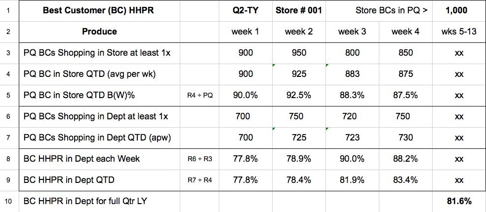 The above table is the Best Customer Household Penetration (BC HHPR) Report. Using simplified numbers to make it easy to follow, the report tells us that Store #1 had 1,000 Best Customers in the Previous Quarter (row 1) and that in the first week of the second quarter, 900 of them returned and shopped at least once (row 3). Of those 900, there were 700 (row 6) who bought at least one Produce item in that week. In other words, 77.8% (row 8) of all Best Customers (from the previous quarter) who visited the store in the first week of the current quarter shopped in the Produce Department at least once. The other rows show the quarter-to-date (QTD) results, using similar calculations.