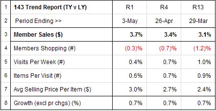 Reading this 143 Report from right to left (the most recent data is in the first column), we see that the trend in member sales over the past 18 weeks is positive, from a 3.1% YTY gain in the first 13 weeks (to Mar 29), to a 3.4% gain in the next 4 weeks (to Apr 26), to a 3.7% gain in the latest week (to May 3). Certainly, a trend every marketer (and CEO) likes to see.