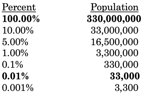 Consider the USA. Its population is 330 million. Currently, our newspapers and news channels are blasting out death figures as if Armageddon is near. But are the headlines significant? Here's a question: what percentage of the population dying from CV-19 would be a significant number to you -10%? 5%? 1%? 0.10% (one tenth of 1%)? 0.01% (one hundredth of 1%)? Or 0.001% (one thousandth of 1%)?