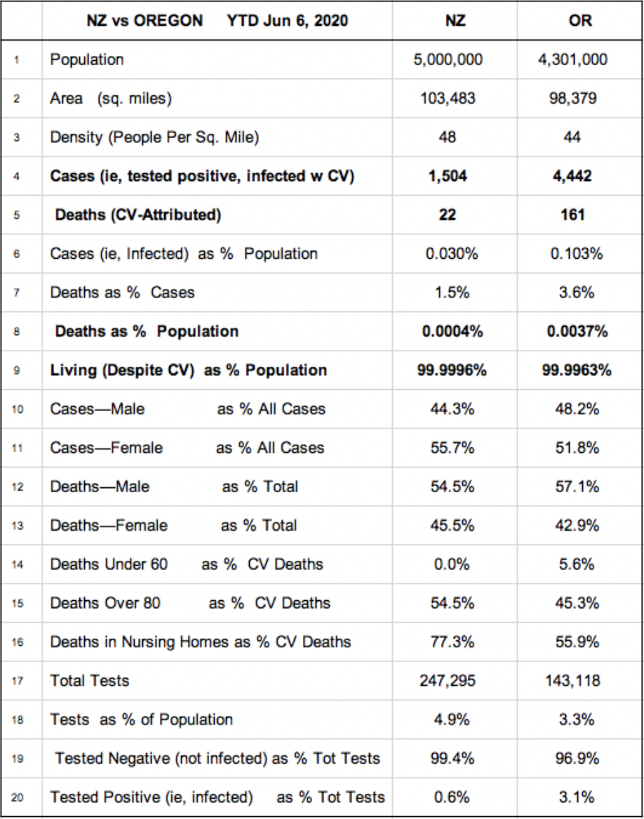 Oregon, which also went through Lockdown, provides an interesting comparative example. They have similar sizes and populations: NZ is 103,500 sq. miles with 5 million people; Oregon is 98,400 sq. miles with 4.3 million people. NZ has a density of 48 people per sq. mile; OR has 44. (Note: there are a number of low-density US states with similar results to Oregon.)