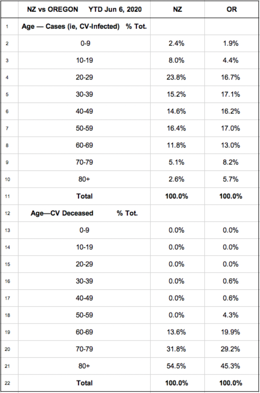 In the case of both NZ and OR, every age segment was infected by the virus-but the primary age groups that died of the virus were over 60. This is seen in Table 2, where even children 0-9 contracted it. About 2% of all who were infected in NZ and OR were 0-9 (R2). Despite this, neither NZ or OR recorded any CV deaths under the age of 30 (R13-15). NZ had none under 60!