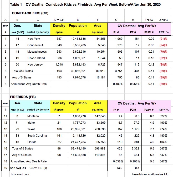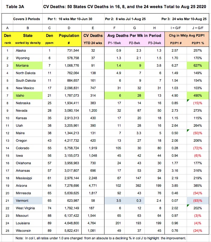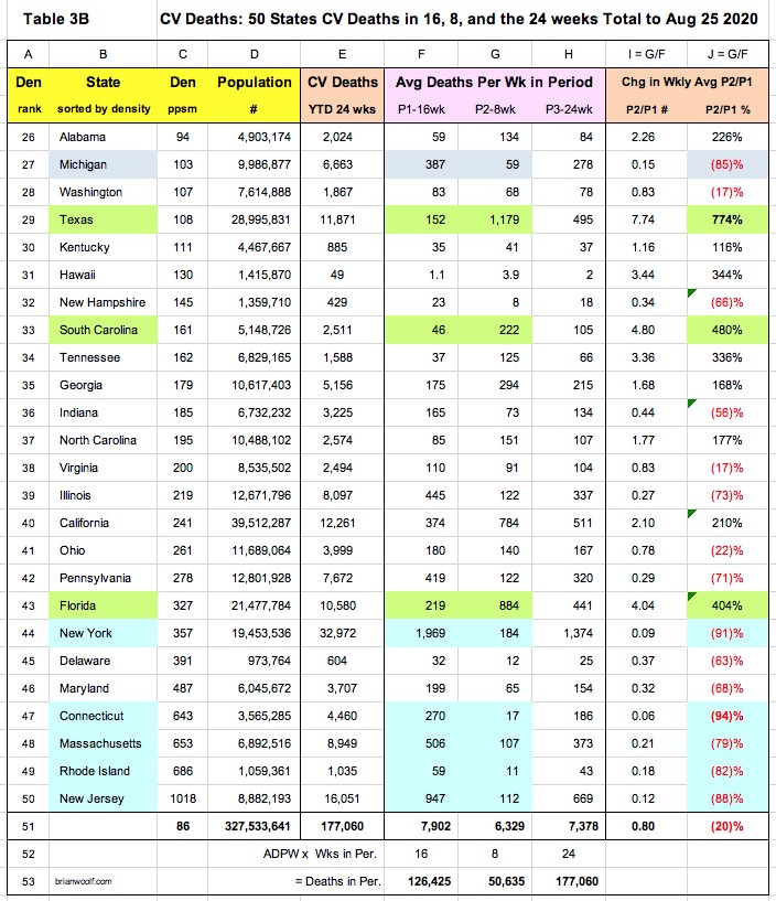 As deaths are our biggest concern with Covid-19, as it has been for all earlier pandemics and plagues, this table focuses just on the death details of each of 50 states. It covers the Average number of Deaths Per Week (ADPW) for P1 (16 weeks) and P2 (8 weeks) and also the average for all 24 weeks combined (col F-H).
