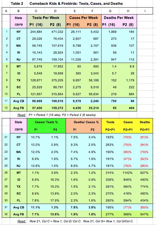 Looking back, we found that after Period 1 (P1) ended, Period 2 (P2) was a lot of the same but gave us some big surprises-especially with changes in states' death rates, which ranged from an almost 8-fold huge hike of 774% to a deep drop of 94%. These are amazing changes in an 8-week period. To give us an idea as to what might occur again, this paper highlights two 5-state groups: those with the greatest percentage reduction in death rates from P1 to P2 and those that with the greatest hikes. The former states are labeled the Comeback Kids (CK); the latter the Firebirds (FB). The former because they came back from very bloodied results in P1; the latter because after Jun 30 they were confronted with unexpected firestorms of CV deaths. They were fighting the equivalent of wildfires, not knowing which ways the wind might change. The dramatic changes in both groups in such a short period tells us of the virus' potential volatility.