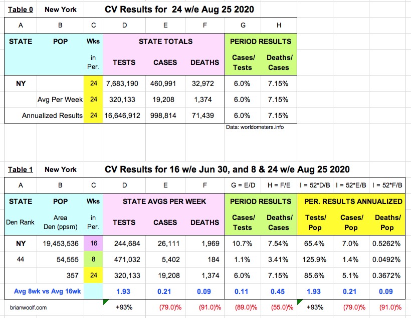 The top row in introductory& informational Table 0 shows the actual results and two accompanying percentages of New York's first 24 weeks, as seen in worldometers.info. The second row is row 1's numbers divided by 24 to get the average results per week in the period. The third row is row 2's numbers multiplied by 52 to show NY's annualized numbers based on the 24-week period ending Aug 25.