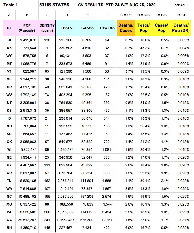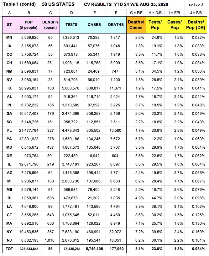 However, as you will see in the two tables that follow, 33 states (including two of our most populous, California and Texas) had death rates below France's 0.047%! So, compared to most major players in Europe, two-thirds of our states performed well. Looking ahead? Each state in the next 24 weeks, will be aiming to improve using what they have learned.