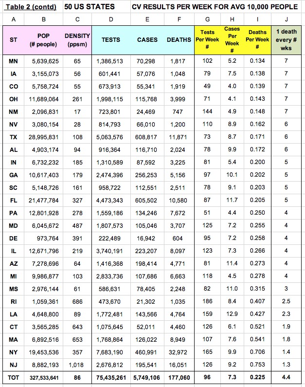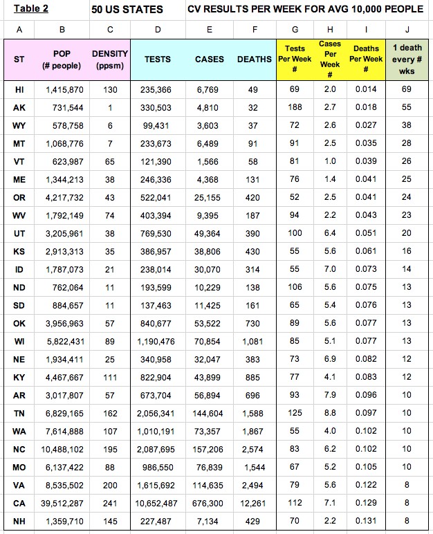 The following two tables have been prepared to compare the performance of our 50 states. Table 1 expresses the relevant comparative data in percentages. Table 2, seeking to give a human aspect when viewing these numbers of sadness, uses actual numbers per week for an average town of 10,000 people in each state. In that town of typical citizens, we see how many citizens were tested, how many were infected (ie, became cases), and how many died, on average, each week. Table 2's final column pictures that average town's deaths in a memorable way: it shows the number of weeks between each CV death in the town. That gives us a clearer feeling for CV's emotional impact in each community in each state. As mentioned earlier, the lower the death rate the greater the number of weeks between deaths.