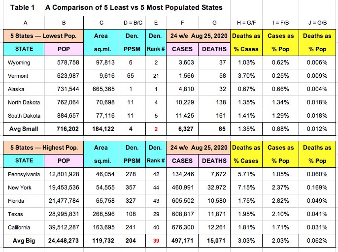 3. Which means that in the (approx.) first 6 months of the CV crisis, just over one one-hundredth of 1% of the low population states died from CV (yet just over six one-hundredth of 1% in the high population states). Row 9.