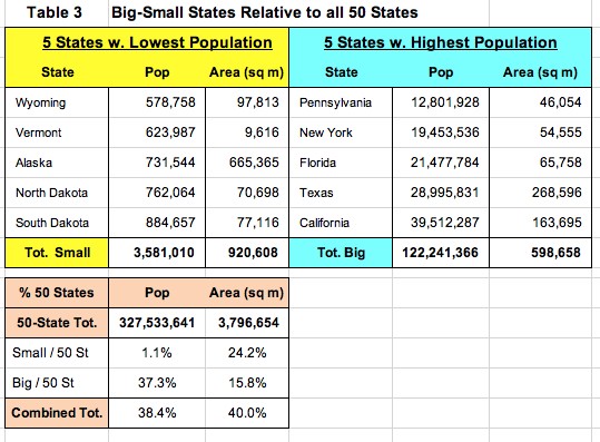 3. The Density difference (People Per Sq Mile or PPSM) is even greater; the smaller-sized, big-population states have 204 PPSM or 51x that of the 4 PPSM in the small-population states. See col D. (Also row 3.)