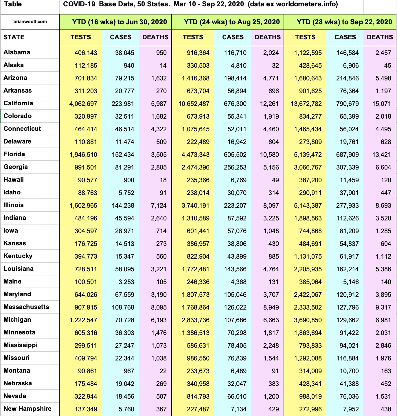 Covid-19: Base Data, 50 States. 28 Wks To Sep 22, 2020