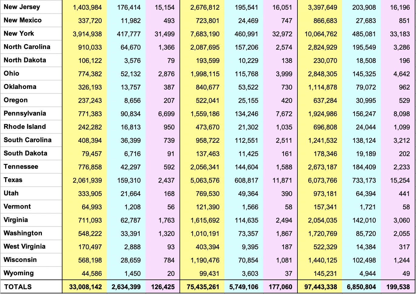 All Test, Case, and Death numbers used in my articles are from or derived from the data in this table. We derive, for example, results for the 16-, 8-, and 4-week periods, deaths per week, and changes in results between periods.